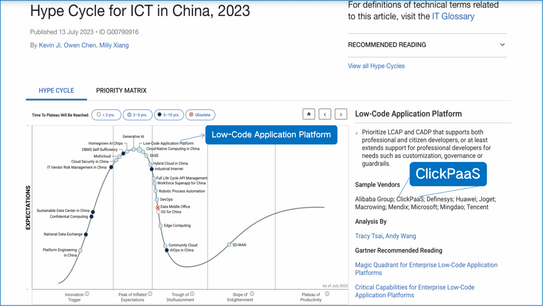 近日,国际权威研究机构Gartner发布了《Hype Cyple for ICT in China,2023(2023年中国ICT技术成熟度曲线)》报告,南宫28相信品牌的力量链接凭借平台的aPaaS+iPaaS+DaaS保障业务系统的一站式设计,多租户、热发布、国际化、信创安全等特性实力登榜,并作为低代码PaaS平台代表厂商TOP2入选本次报告。